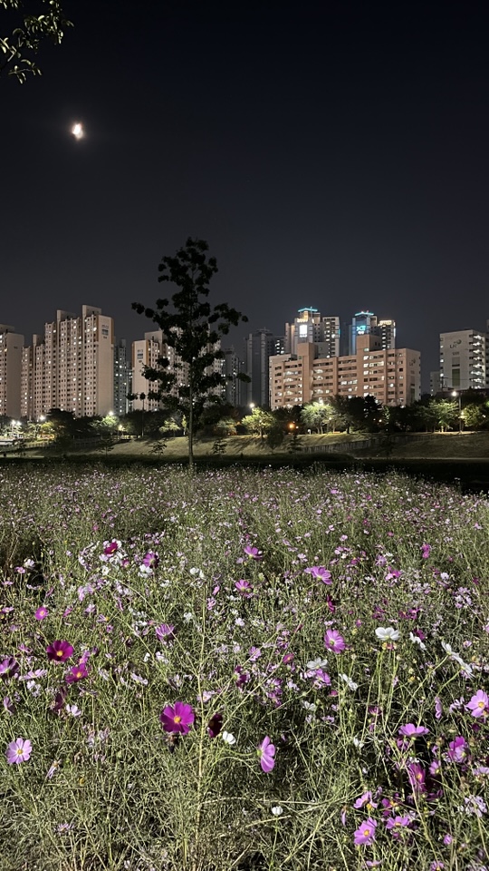 어두운 하늘, 멀리서 퍼지듯 보이는 노을, 그리고 눈앞에 펼쳐진 꽃밭.